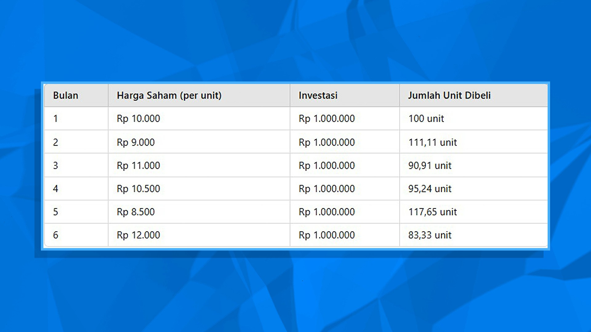 Setelah 6 bulan, kamu memiliki total unit lebih banyak dibandingkan jika kamu membeli semua saham sekaligus di bulan pertama. Ini karena saat harga lebih rendah, kamu membeli lebih banyak unit, dan saat harga lebih tinggi, kamu membeli lebih sedikit unit.